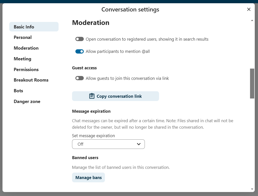 Moderators can configure the conversation. Select Conversation settings from the ... menu of the conversation on the top to access the settings.