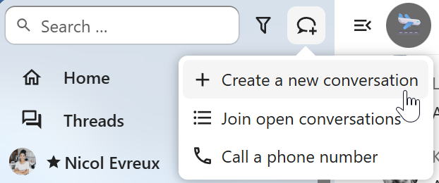 Shortcut actions to create new conversations, join open ones, or quickly check your media devices.