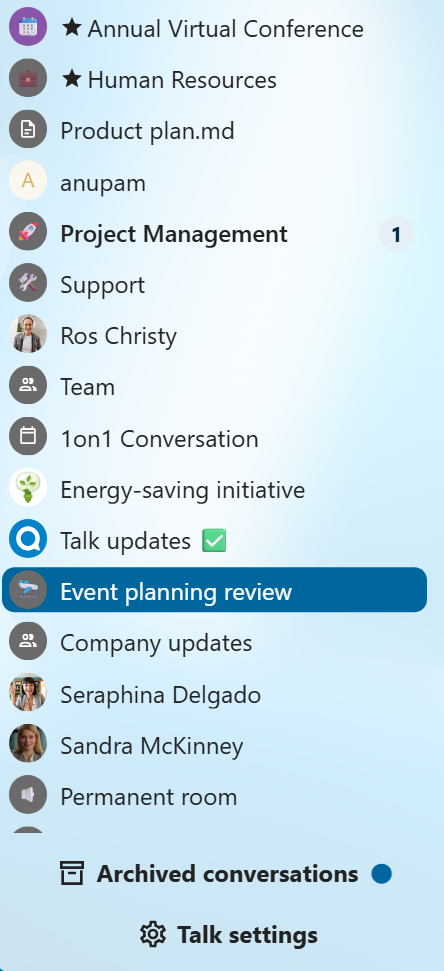 Instant meetings: these conversations can be created for quick, ad-hoc meetings. They can be started instantly from the Talk Dashboard.
