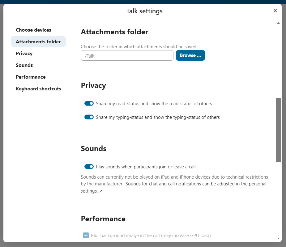 You can change other settings in the Talk settings dialog.