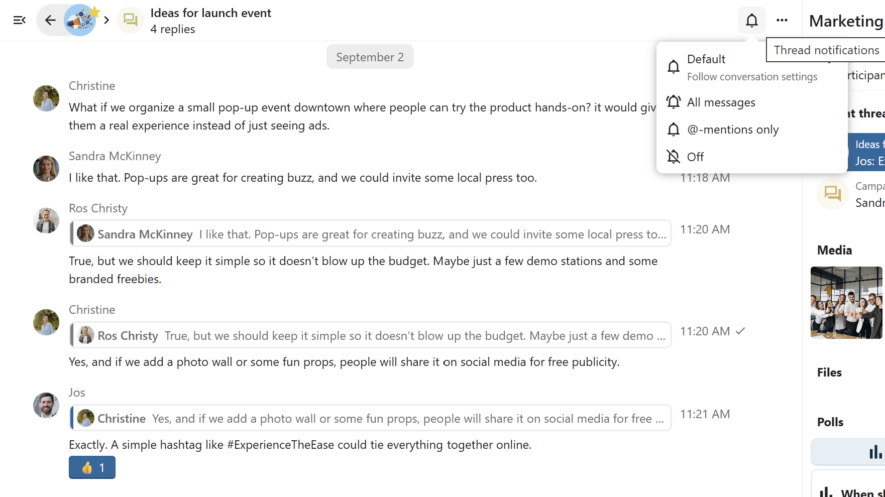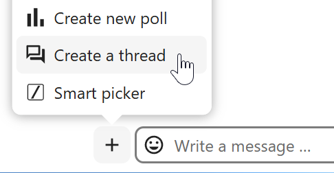 You can create threads in conversations to keep discussions organized. The thread creation option is available in the new message additional actions.