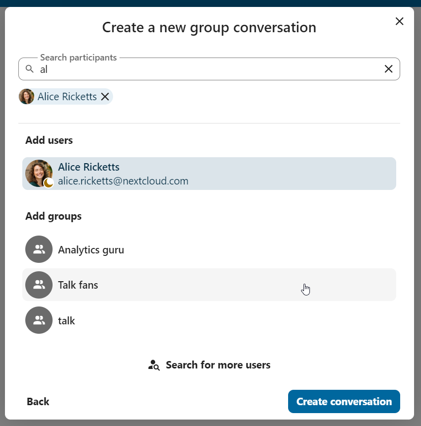 In the second step, you get to add participants and finalize the creation of the conversation.