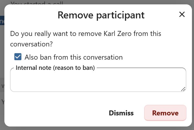 There, toggle checkbox Also ban from this conversation and provide a reason for the ban. The banned user will be removed and prevented from rejoining.
