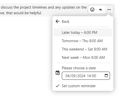 You can set reminders on specific messages. If there’s an important message you want to be notified about later, simply hover over it and click on the reminder icon.