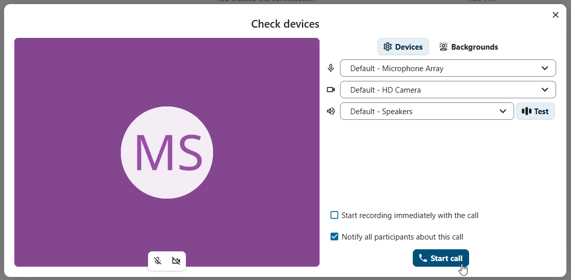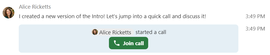 When you’re in a conversation, you can start a call any time with the Start call button. Other participants will get notified and can join the call.