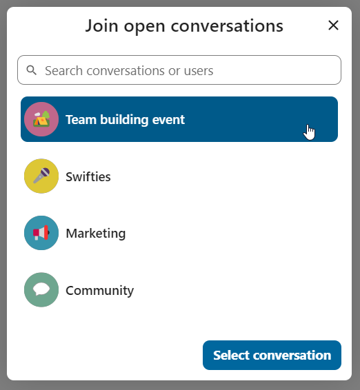 You can view all the conversations that you can join by clicking the button next to the search field and filters button and then on Join open conversations.