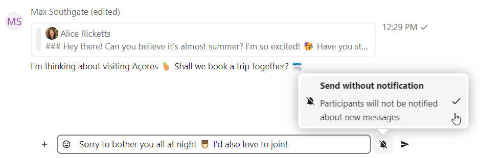 If you don’t want to disturb anyone in the middle of the night, there is a silent mode for chatting. While it is enabled, other participants will not receive notifications from your messages.