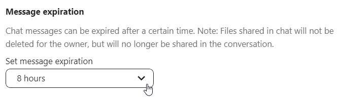 The available expiration durations are 1 hour, 8 hours, 1 day, 1 week, 4 weeks, or never (which is the default setting).