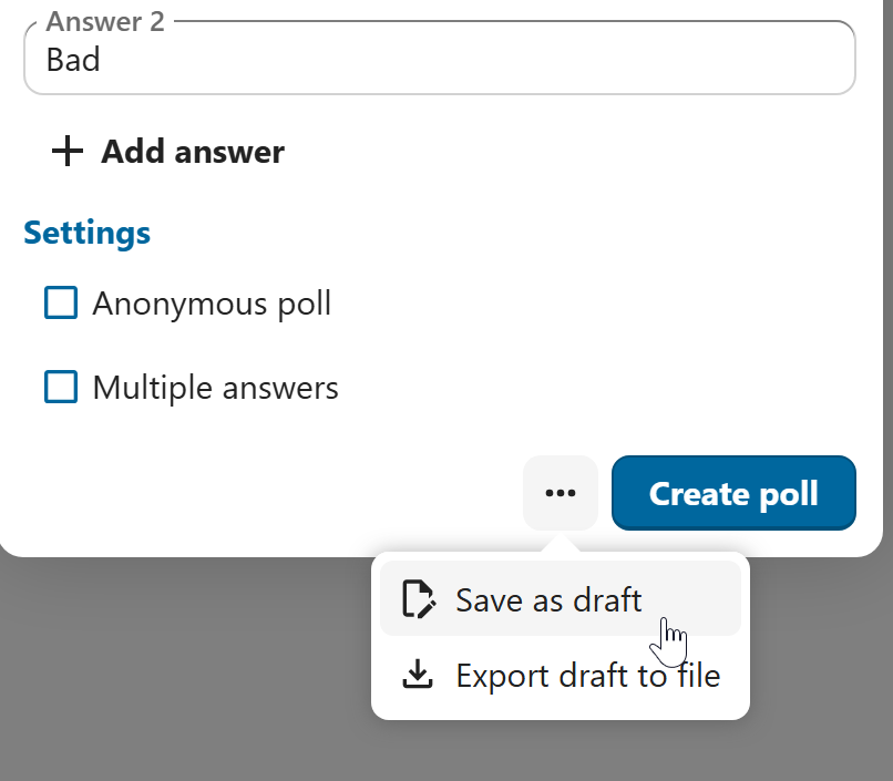 As a moderator, you can create the poll directly or you can save it as a draft to edit it later.